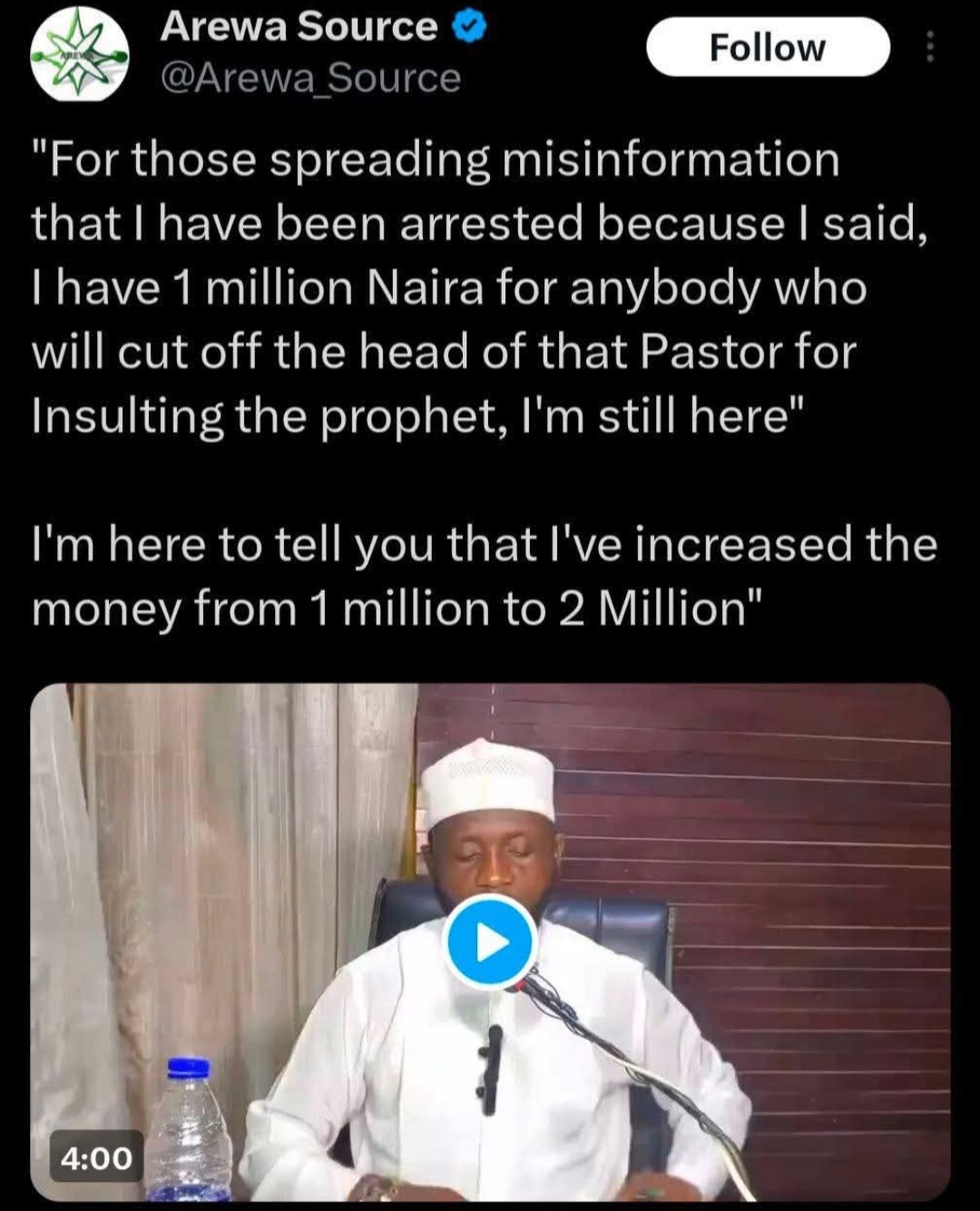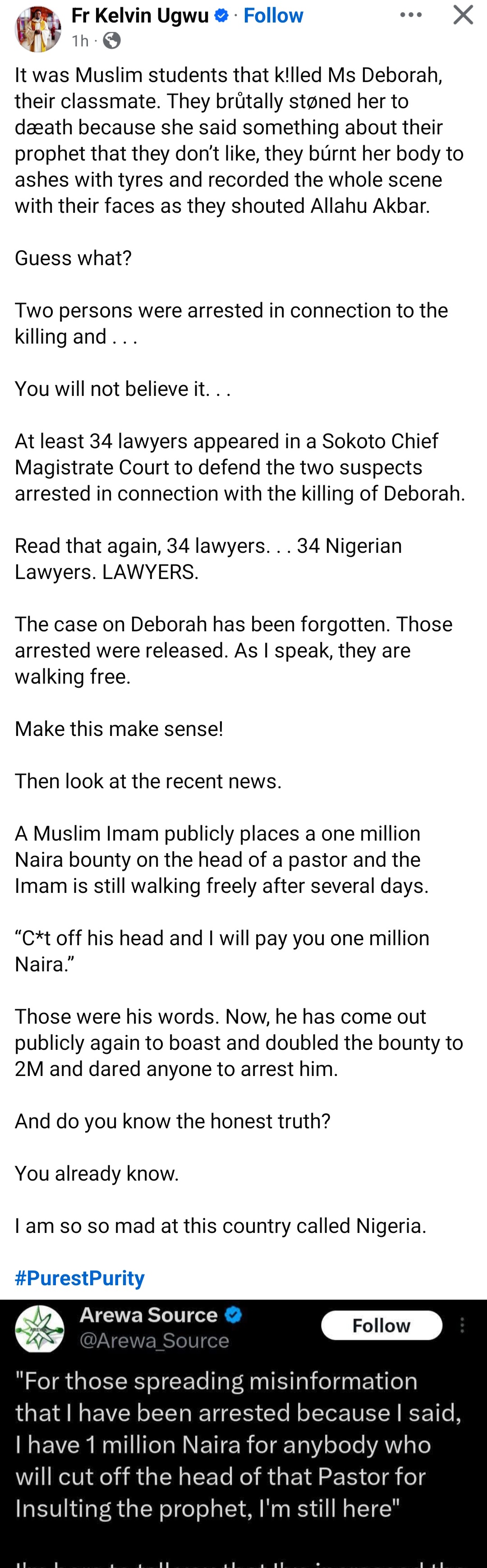 A Catholic Priest has expressed outrage after an Imam placed a bounty on the head of a pastor he claims insulted Prophet Mohammed. The Imam initially placed a one million Naira bounty but later increases it to 2 million Naira and went ahead to boast about being free after making the threat on a pastor’s life. Reacting, a Catholic Priest named Father Kelvin Ugwu pointed out that a student named Deborah was k!lled by her classmates for alleged blasphemy and scores of lawyers turned up to defend the suspects. He added that an Imam has now made a threat to life over alleged blasphemy and is still walking free. Fr. Ugwu wrote: “It was Muslim students that k!lled Ms Deborah, their classmate. They brtally stned her to dath because she said something about their prophet that they dont like, they brnt her body to ashes with tyres and recorded the whole scene with their faces as they shouted Allahu Akbar. “Guess what? Two persons were arrested in connection to the killing and . . . You will not believe it. . . “At least 34 lawyers appeared in a Sokoto Chief Magistrate Court to defend the two suspects arrested in connection with the killing of Deborah . “Read that again, 34 lawyers. . . 34 Nigerian Lawyers. LAWYERS. “The case on Deborah has been forgotten. Those arrested were released. As I speak, they are walking free. “Make this make sense! “Then look at the recent news. “A Muslim Imam publicly places a one million Naira bounty on the head of a pastor and the Imam is still walking freely after several days. “‘C*t off his head and I will pay you one million Naira.’ “Those were his words. Now, he has come out publicly again to boast and doubled the bounty to 2M and dared anyone to arrest him. “And do you know the honest truth? “You already know. “I am so so mad at this country called Nigeria.”