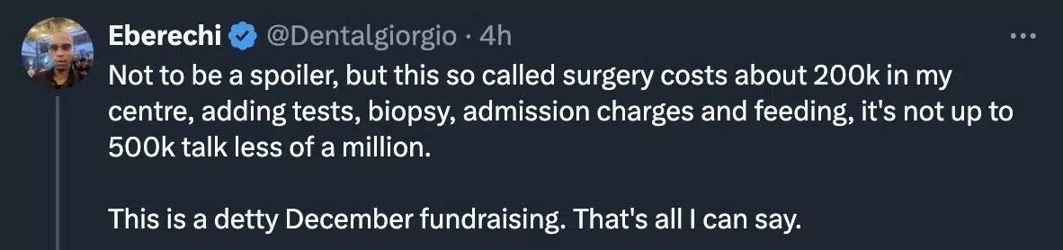 “Not to be a spoiler, but this so called surgery costs about 200k in my centre, adding tests, biopsy, admission charges and feeding, it’s not up to 500k talk less of a million. This is a detty December fundraising. That’s all I can say,”