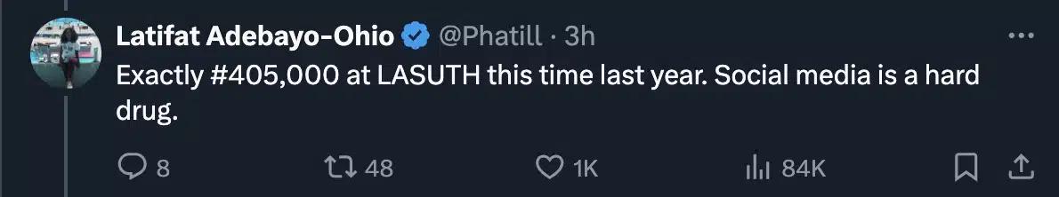 “Exactly #405,000 at LASUTH this time last year. Social media is a hard drug,” she added.