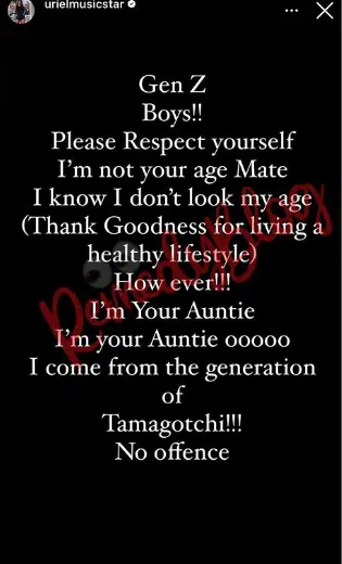 “Gen Z Boys!! Please respect yourself. I’m not your age mate. I know I don’t look my age (Thank Goodness for living a healthy lifestyle) However!!! I’m your Auntie. I’m your oooo” I come from the generation of Tamagotchi!!! no offence”